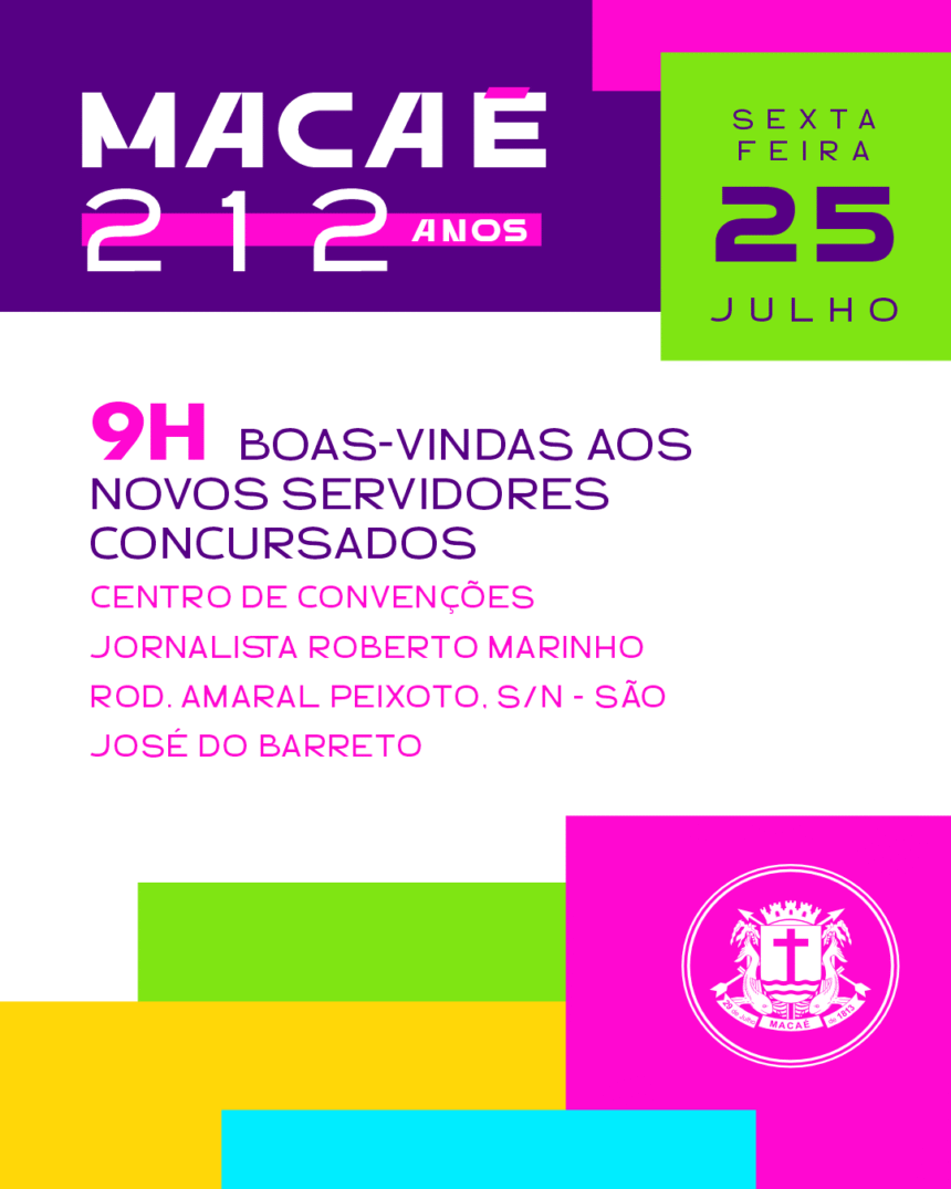 • Sexta-feira (25) – 9h – Boas-vindas dos novos servidores concursados, no Centro de Convenções Jornalista Roberto Marinho.