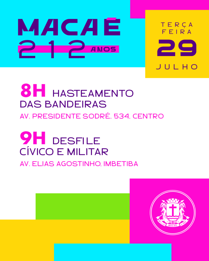 E no dia do aniversário da cidade, 29 de julho, será realizado o Hasteamento das Bandeiras na Avenida Presidente Sodré, nº 534, no centro. A cerimônia está prevista para às 8h. Na sequência, às 9h, o tradicional Desfile Cívico e Militar, na Av. Elias Agostinho, Imbetiba.