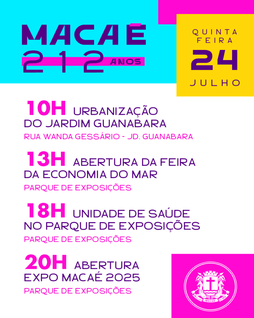 O Jardim Guanabara também fará parte da programação, sendo contemplado com um projeto de urbanização na Rua Wanda Gessário. O projeto deve ser entregue aos moradores na próxima quinta-feira (24). No mesmo dia, às 13h, será realizada a abertura da Feira da Economia do Mar, no Parque de Exposições Latiff Mussi Rocha. Às 18h, será entregue para a população mais uma unidade de Saúde no Parque de Exposições Latiff Mussi Rocha e às 20h, será a abertura da Expo Macaé 2025.
