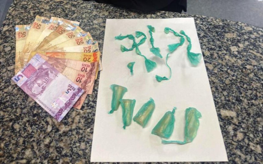 Durante patrulhamento na região, os policiais identificaram dois homens em atitude suspeita. Um deles trajava bermuda jeans e estava sem camisa, com cabelo descolorido, enquanto o outro vestia blusa preta e bermuda listrada. Ao notarem a presença da equipe, os indivíduos tentaram fugir para o interior da comunidade, abandonando duas carteiras de cigarro que escondiam 17 pedras de crack e cinco pinos de cocaína, além de R$ 395 em dinheiro.